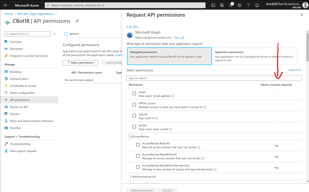 In the Azure AD portal, you can see both delegated and application permissions for the Microsoft Graph. Notice that there’s a column for “Administrative Consent Required”. If this field is blank, then users can consent for themselves; if it’s marked “yes”, then a tenant administrator has to grant consent.