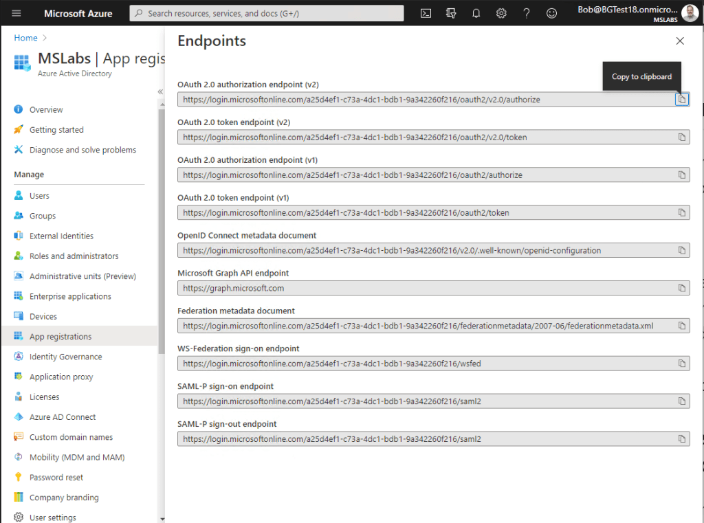 In some scenarios, you’ll need to know the endpoint URL. You can find it in the Azure AD portal under App Registrations – not under a specific app registration, but in the App Registrations panel; it’s the same for all the apps in your tenant.