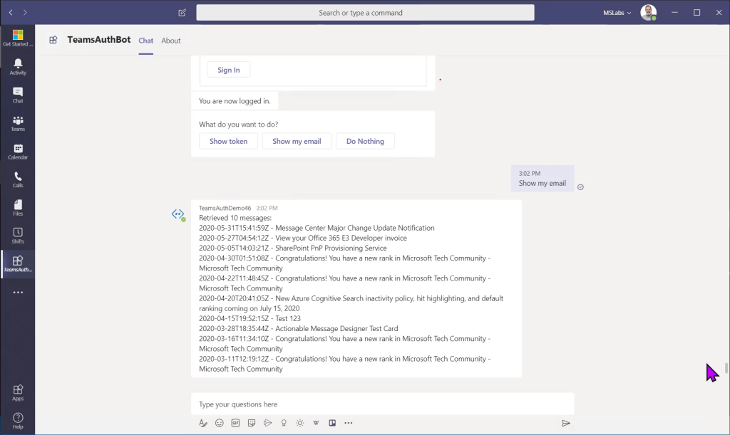 I wrote these articles hoping they’ll assist developers in calling the Graph from Microsoft Teams. They’re also companions for my talk, “Calling Microsoft Graph from your Teams Application”, at the PnP Virtual Conference 2020.
